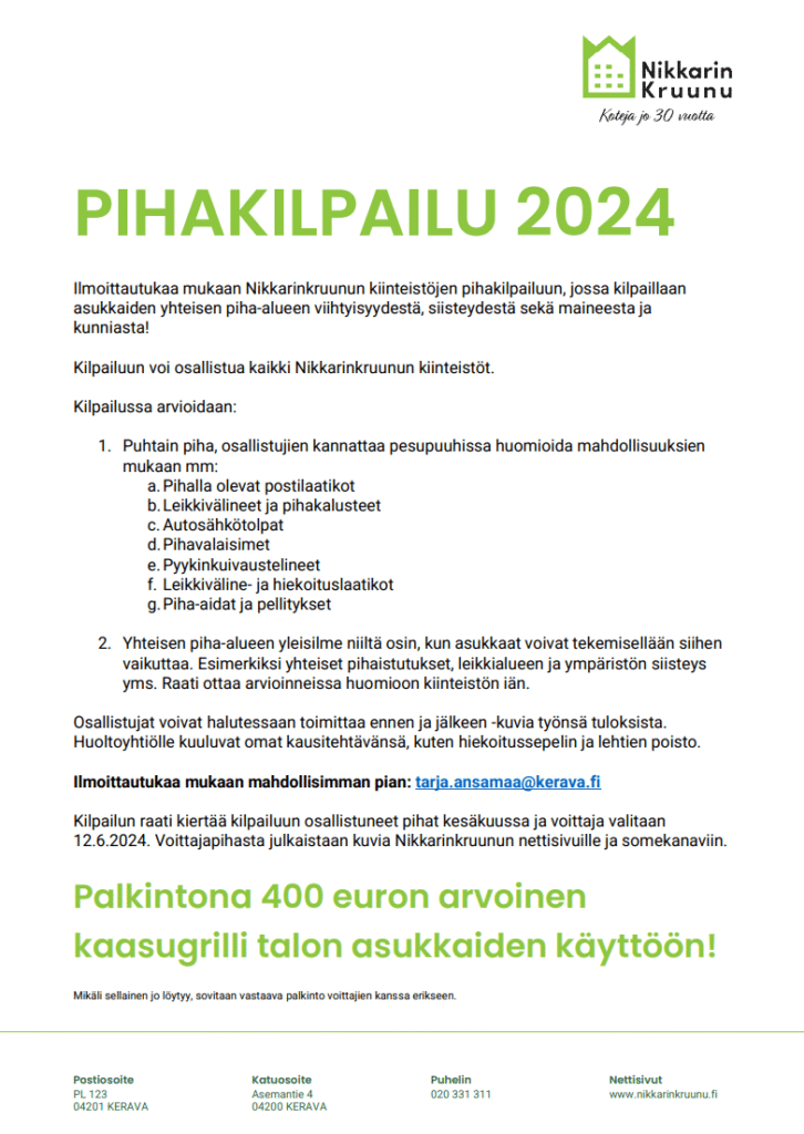 Ilmoittautukaa mukaan Nikkarinkruunun kiinteistöjen pihakilpailuun, jossa kilpaillaan asukkaiden yhteisen piha-alueen viihtyisyydestä, siisteydestä sekä maineesta ja