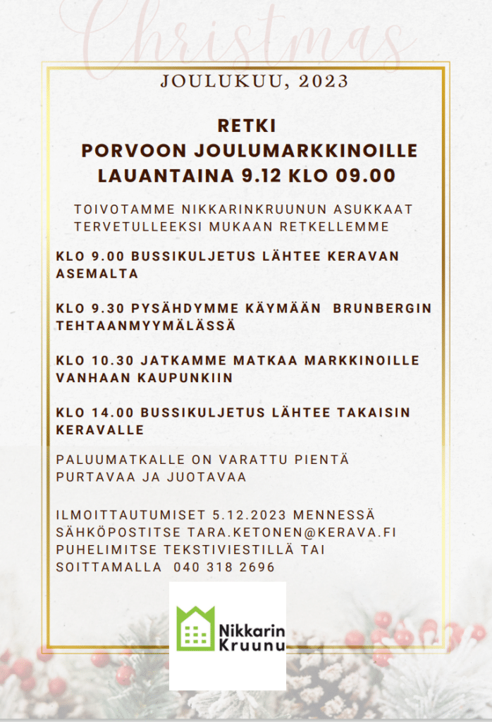 Vielä on paikkoja vapaana asukkaiden retkelle Porvoon joulumarkkinoille! Ilmoittaudu mukaan!